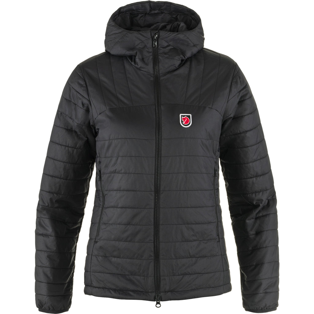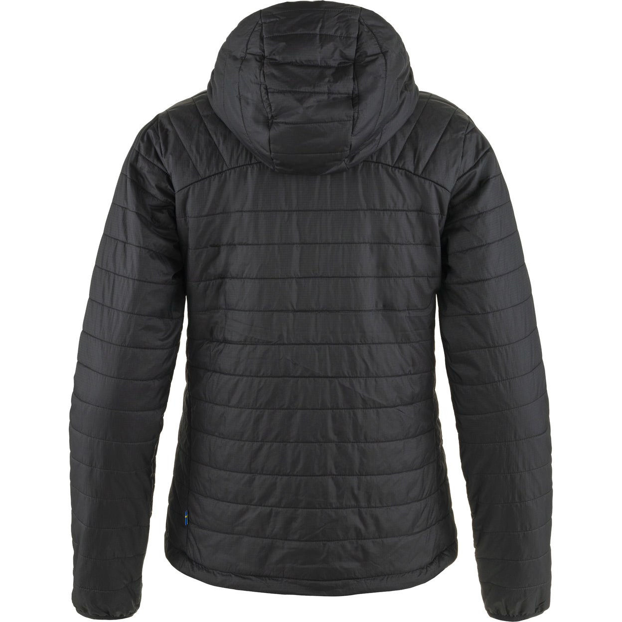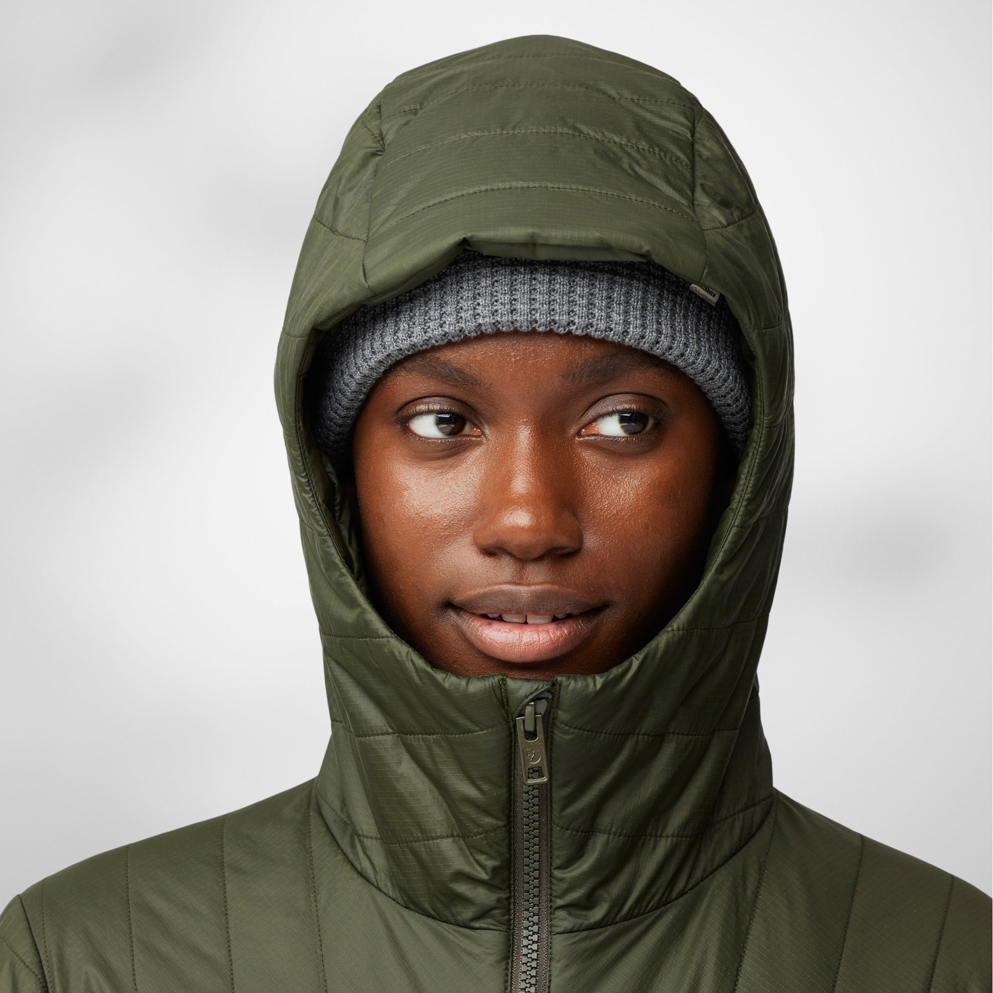The perfect lightweight and packable insulation layer for when you need a little extra something to keep your temperature and spirits up. Expedition X-Lätt Hoodie for women is made from pliant recycled polyamide with recycled polyester insulation with a down-like puffiness and loft. It slides easily under a shell jacket and keeps you warm even in damp conditions. Zippered hand pockets and inside chest pocket and the hood and hem adjustments are designed for easy repairs.