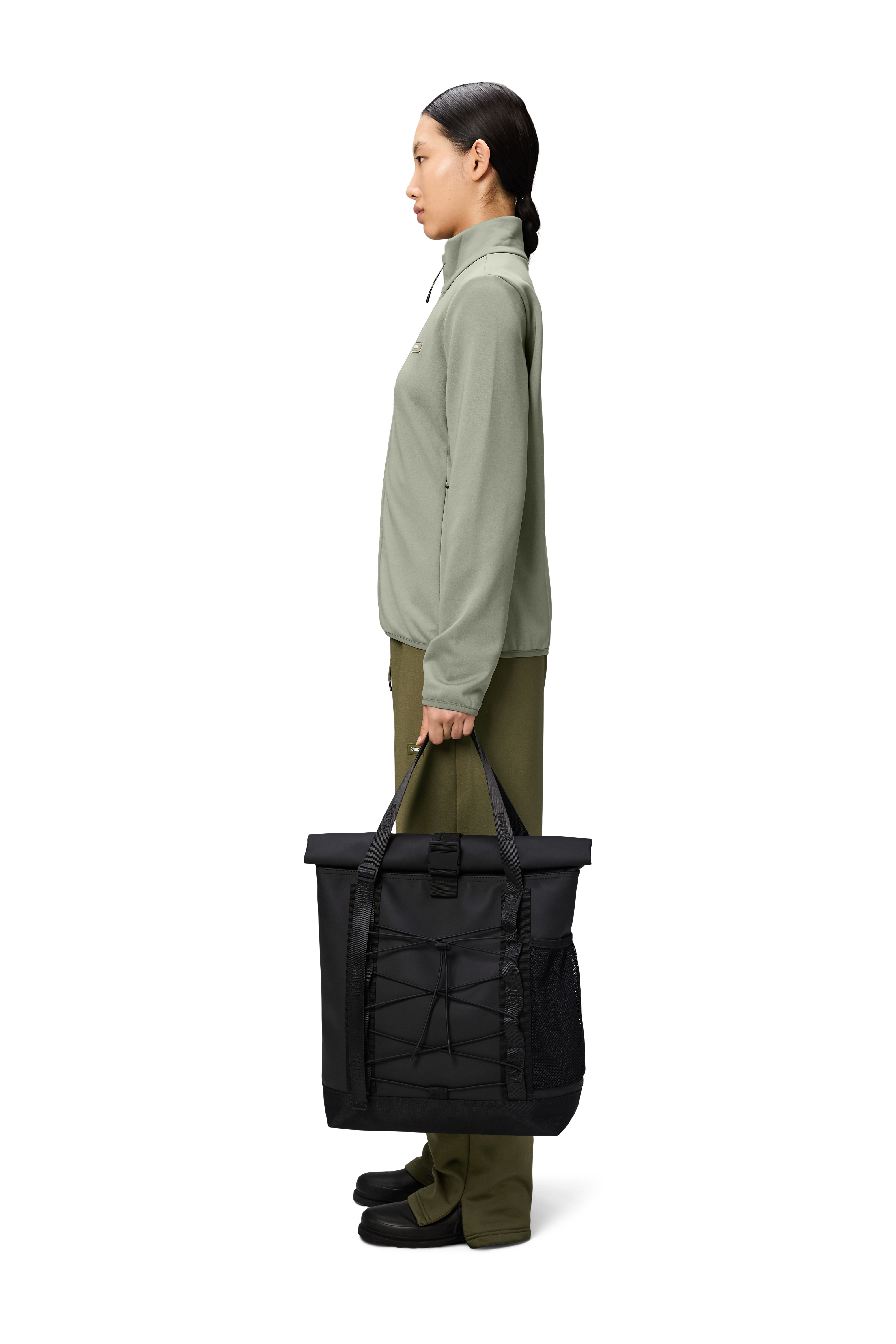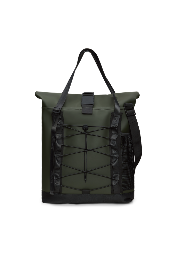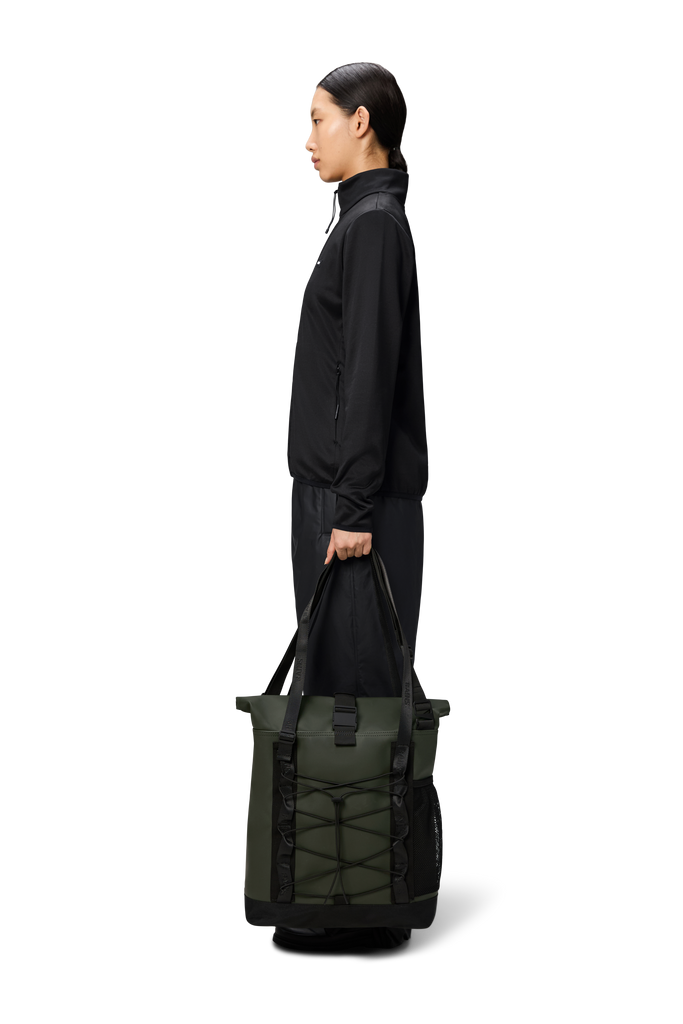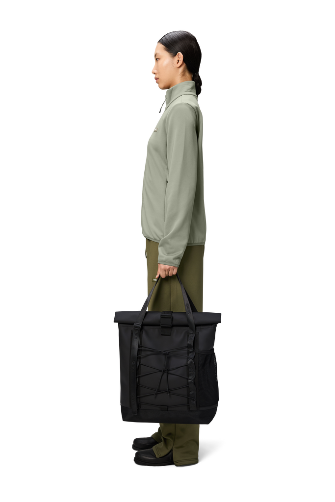 Trail Rolltop Tote Bag is a restyled version of the original Tote bag, characterized by a rolltop opening and elastic cords on the front panel.
