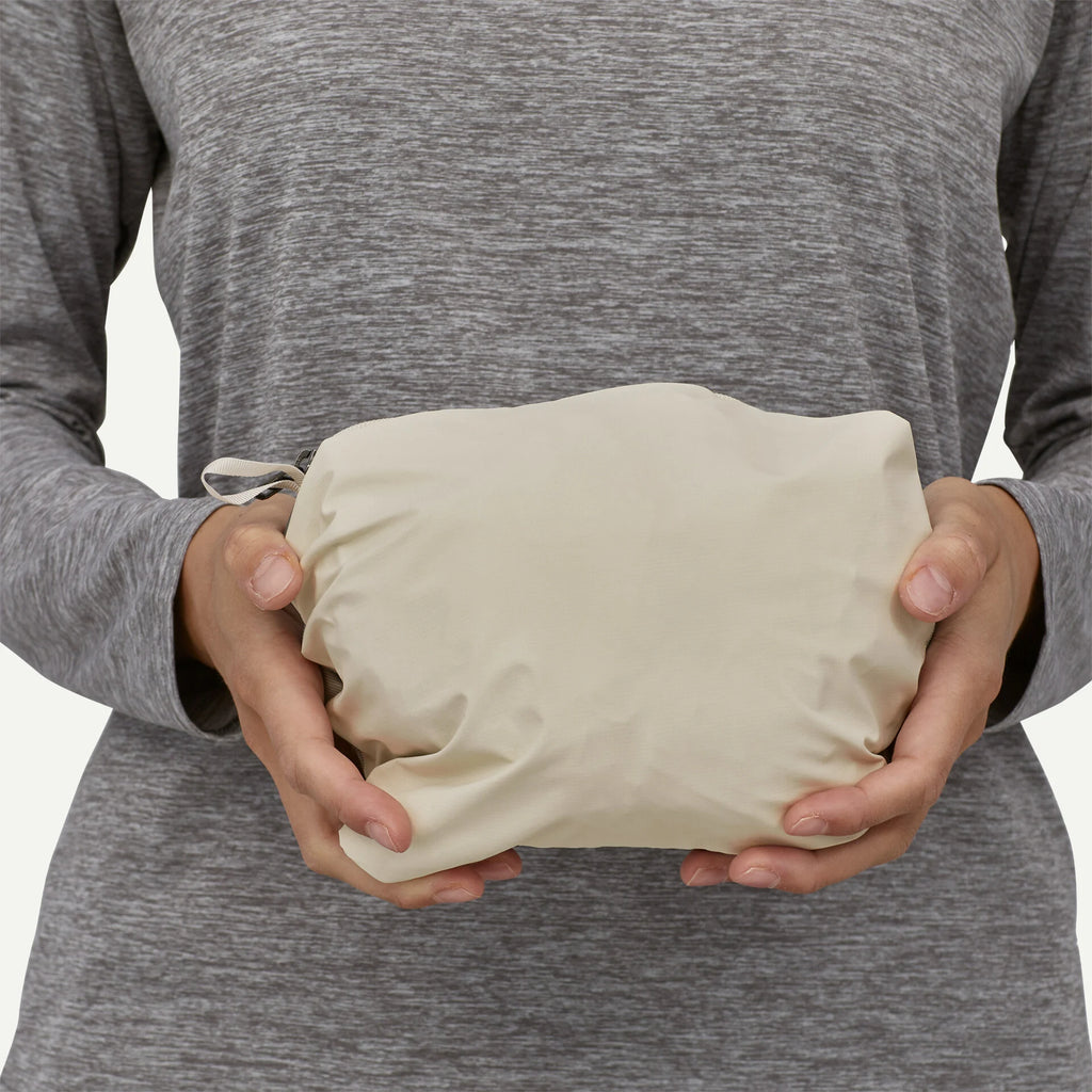 Two handwarmer welt pockets, and venting pit zips with welted exterior storm flaps; the jacket self-stuffs into the left handwarmer pocket with a carabiner clip-in loop -